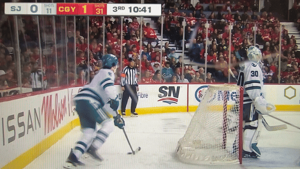 Next shift, Eklund beats Backlund (11), the Flames’ F1, then skates up the gut of the Flames’ defense, dishing it to the once-again open Celebrini, who tries to hit Adam Gaudette (81) for the one-timer feed.